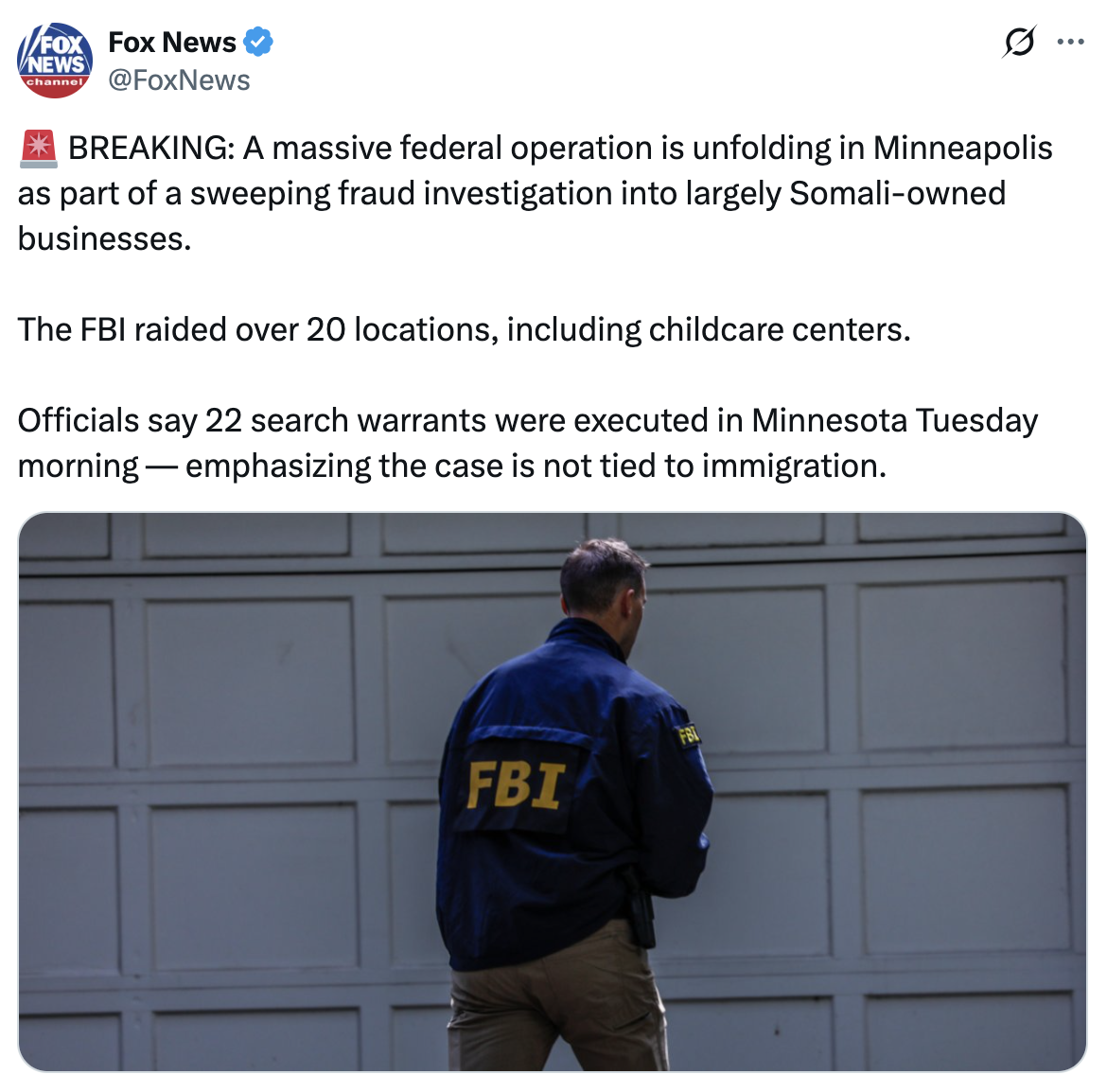 Federal agents fanned out across Minneapolis early Tuesday, hitting more than 20 locations in a sweeping fraud probe focused on a network of largely Somali-owned businesses, including child care centers.