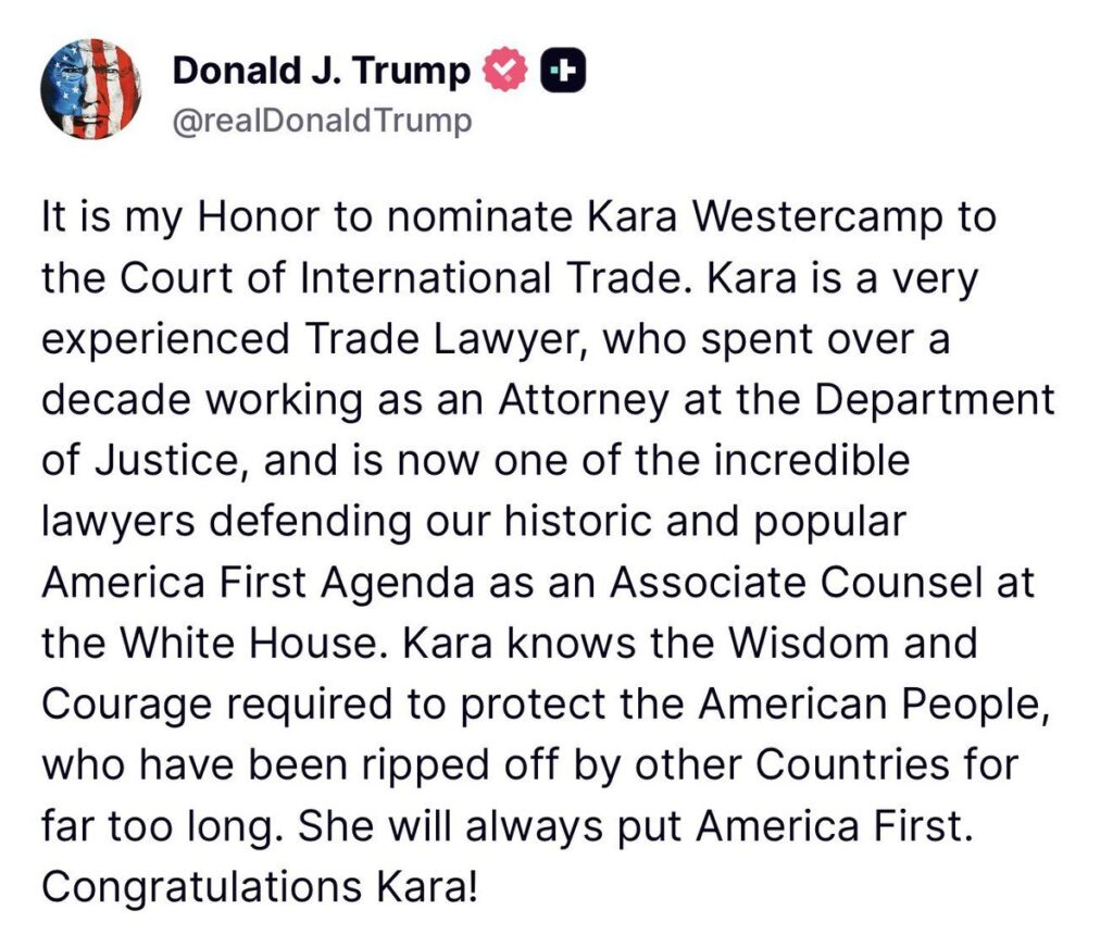 Washington, D.C. — President Donald J. Trump today announced his intent to nominate Kara Westercamp to serve as a judge on the United States Court of International Trade, placing a key pro-tariff legal thinker on a court central to the administration’s trade policy agenda.