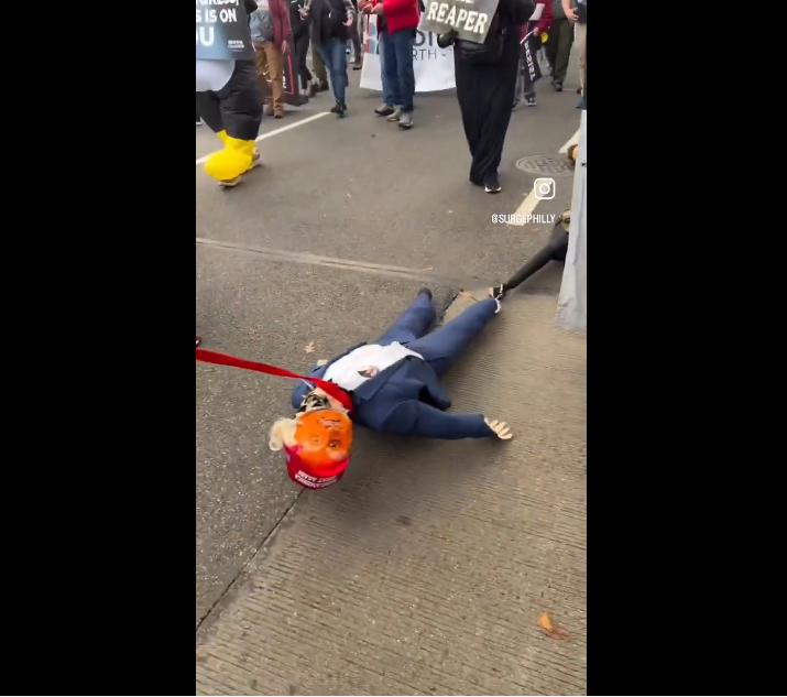 Video from the scene shows the protester pulling the effigy and making a series of inflammatory remarks when confronted about the graphic display. When asked whether she supported political violence, the protester responded: