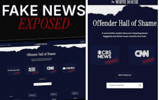 The website also includes an “Offender Hall of Shame,” presented as a running record of stories that the White House says contain false or misleading information. Visitors are prompted to browse through the listed claims under the heading, “Scroll for the Truth.”